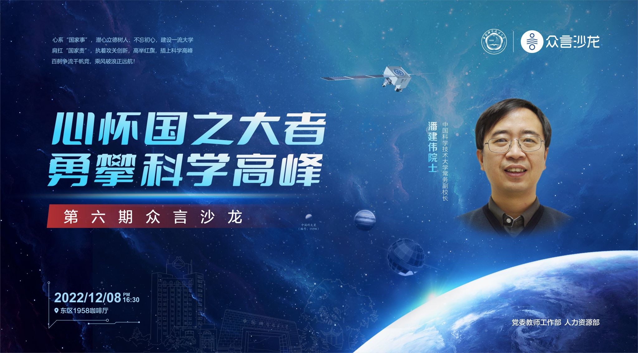第六期众言沙龙活动将以“心怀国之大者 勇攀科学高峰”为主题,邀请潘建伟院士与教师进行面对面交流,搭建沟通平台,助力教师成长。活动定于128日(周四)下午4:30在东区1958咖啡厅开展,报名链接:https://www.wjx.cn/vm/w7F1ya0.aspx#,诚挚欢迎感兴趣教师报名参加!报名通过者将另行发送通知,欲报从速。