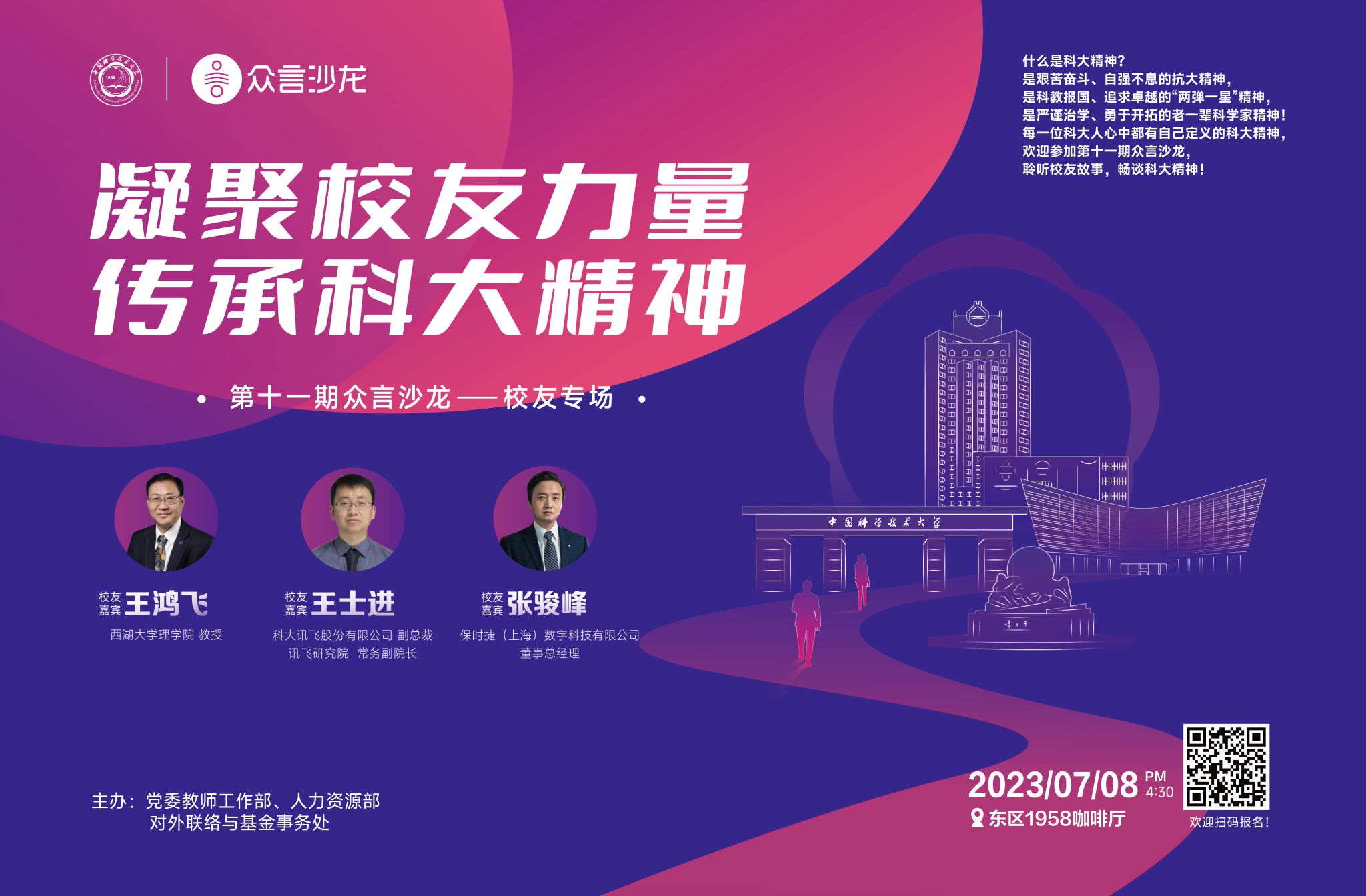第十一期“众言沙龙”活动将以“凝聚校友力量 传承科大精神”为主题,邀请校友代表与大家面对面交流。活动将于78日(周六)下午4:30在东区1958咖啡厅开展,诚挚欢迎感兴趣师生和校友报名参加!报名链接:https://www.wjx.cn/vm/epT3PQO.aspx#。报名通过者将另行通知,欲报从速。