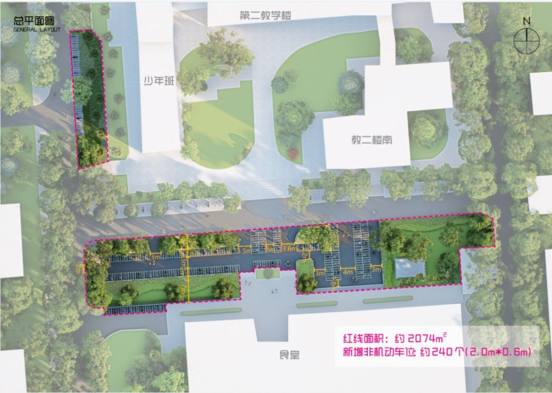 将东校区学生食堂北侧绿地局部改造为非机动车停车位,增加非机动车停车数量。